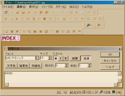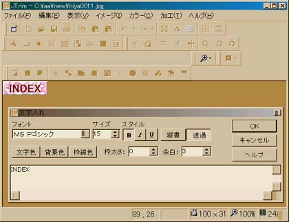 2.「A」のアイコンをクリック。これで、文字が入れられます。 ウインドウの位置を少しずらして、バナーが見えるようにしておくといいです。 3.乗せたい文字を入力します。バナーの上に表示されるはず。 4.「透過」アイコンをクリックして背景の白を消します。 5.「枠太さ」を0にして、枠線を消します。
