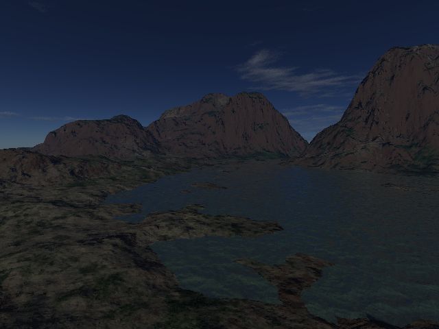 | ■夜っぽく見えるかな? 夕日の赤みが消えて蒼く沈んでゆく風景が好きだから、ちょっと挑戦してみたんだけど…ちょっと無理があるかな? 実は、太陽自体は結構真上に来るように設定して、露出の方で暗くしてるのよね。新しいTerragenは、太陽真下…ってのも可能だけど、それだと、さすがに岩のゴツゴツ…とか、まったく見えなくなっちゃうの。何か手段があるのかな? |
